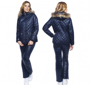 Костюм утепленный состоит из куртки и брюк. Куртка полуприлегающего силуэта с отстегивающимся капюшоном. Капюшон с отстегивающейся опушкой из натурального меха. Центральная застежка на тесьму – «молнию». На полочках обработаны боковые карманы с тесьмой-«молнией». Рукава втачные. В левом рукаве обработан карман для ски-пасса, под проймами — вентиляционные отверстия с молниями. На подкладке обработана юбка для защиты от попадания снега, стянутая по краю плоской резиновой тесьмой с нескользящей поверхностью, ветрозащитная юбка плотно обхватывает талию. Препятствует проникновению ветра и снега внутрь одежды. На подкладке обработаны два внутренних кармана один карман с застежкой на молнии, а второй карман из сетки. Низ куртки регулируется с помощью эластичного шнура и фиксаторов.