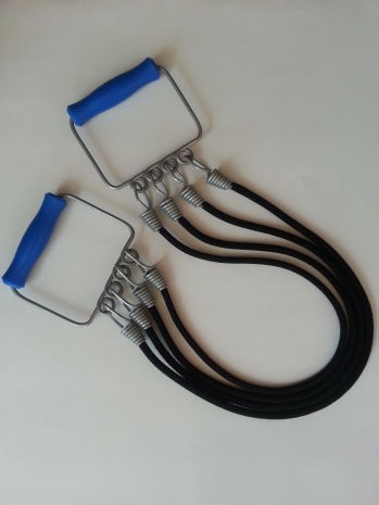 Эспандер классического образца с пластиковыми ручками состоит из 4-х резинотканевых шнуров, желаемое количество которых при помощи металлических карабинов крепится к ручкам для регулирования нагрузки.