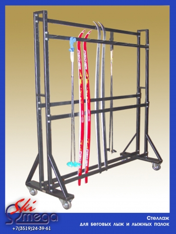 Стойка на 30 пар беговых лыж и лыжных палок мобильная, 2-сторонняя, разборная, регулируемая по высоте для хранения взрослого и детского снаряжения.