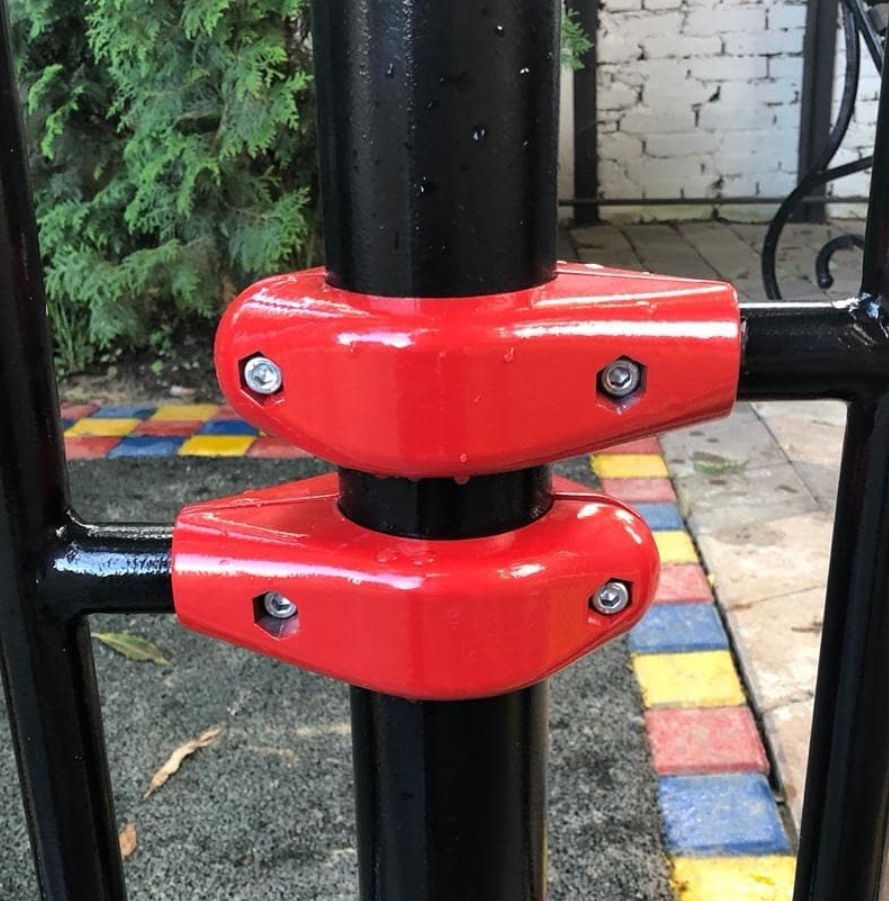 Предназначен для соединения взаимно перпендикулярных труб, фиксируя горизонтальную перекладину Ø34 мм на вертикальной стойке Ø76 мм