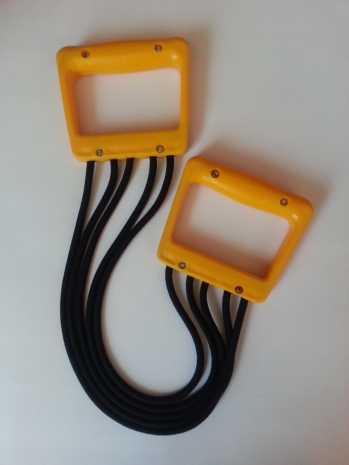 Эспандер нового образца с пластиковыми ручками имеет пять несъемных резинотканевых шнуров, то есть нет возможности регулирования нагрузки, но в отличие от классического эспандера выглядит более эстетично, аккуратно и весит меньше.