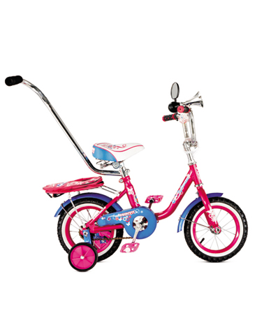 Детский велосипед для девочек с ручкой управления, съемными боковыми колесами и ярким дизайном. Стальные рама и вилка, удобные регулируемые руль и сиденье.