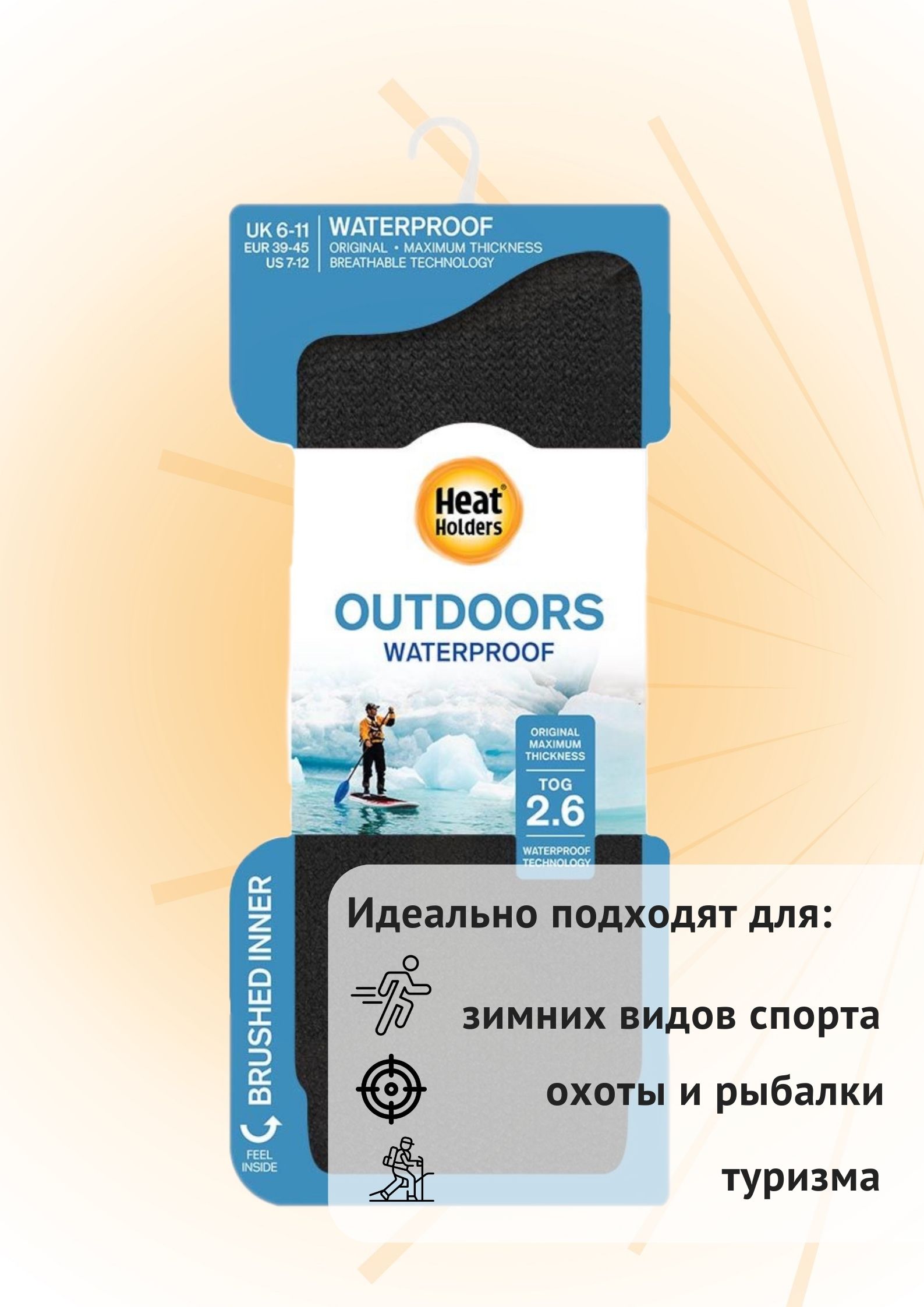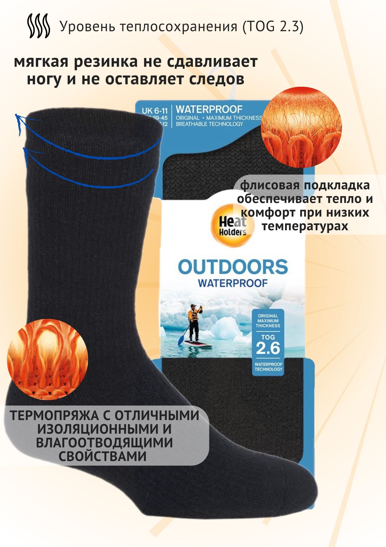 Мужские водонепроницаемые трехслойные термоноски Heat Holders! В модели Waterproof используется теплоизоляционная пряжа высшего качества. Мягкий начес с изнаночной стороны увеличивает воздушную прослойку между носком и ногой, обеспечивая тепло в холодные дни. Термо-пряжа отводит излишнюю влагу, обеспечивая сухость и комфорт в течение всего дня. Идеально подходят для активного отдыха, рыбалки, охоты и зимних видов спорта.