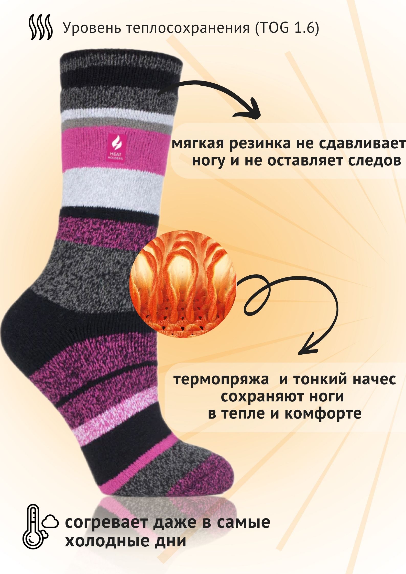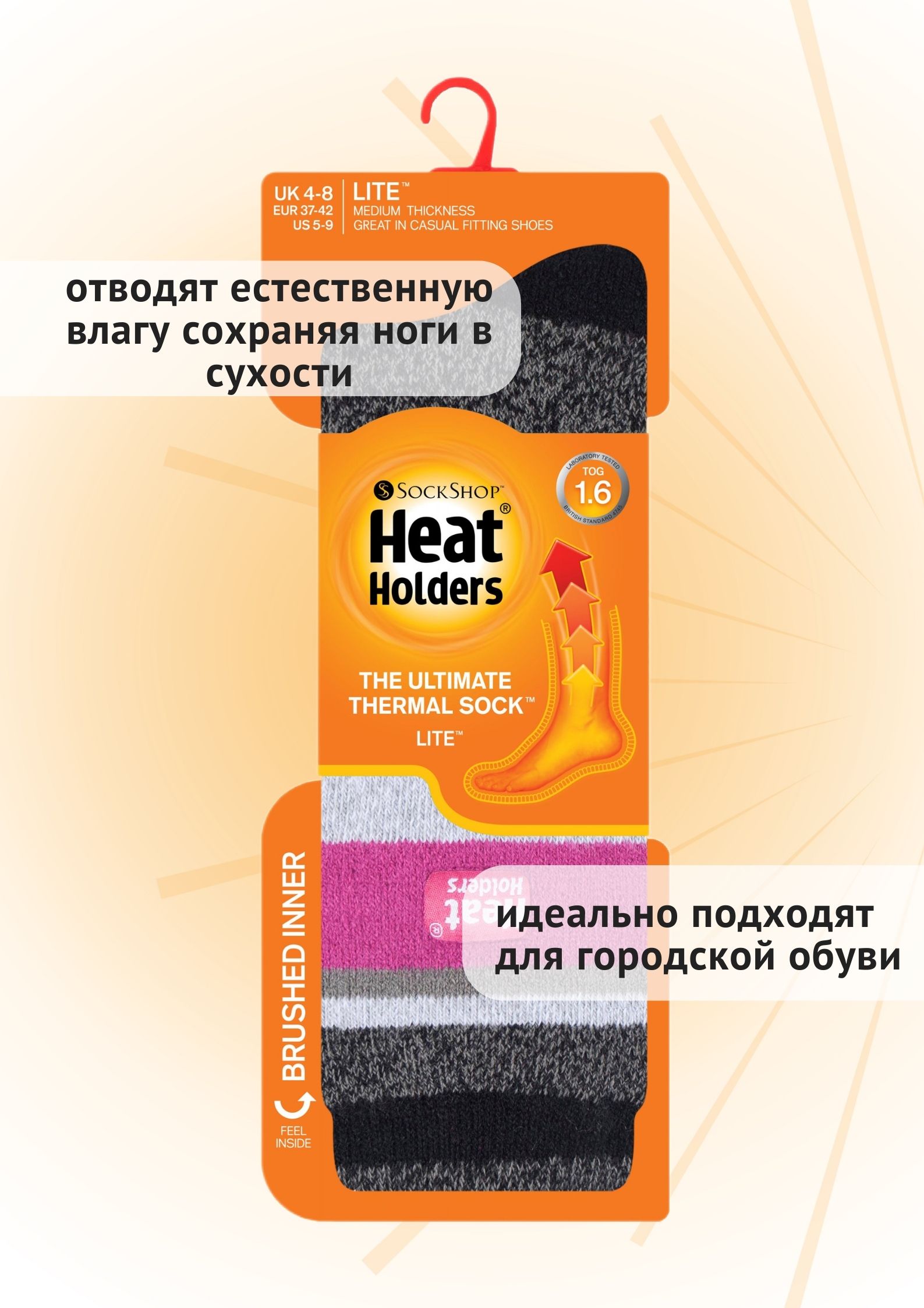 Женские носки Heat Holders Lite! В модели Lite используется тонкая теплоизоляционная пряжа высшего качества. Мягкий тонкий начес с изнаночной стороны увеличивает воздушную прослойку между носком и ногой, обеспечивая тепло даже в холодные дни. Термо-пряжа отводит излишнюю влагу, обеспечивая сухость и комфорт в течение всего дня. Идеально подходят для ежедневного ношения с повседневной обувью.
